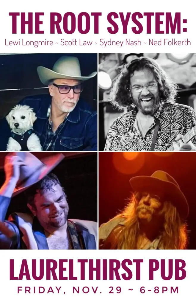 Originally put together for a one-off set at the Oregon Country Fair this year, THE ROOT SYSTEM is Lewi Longmire, Scott Law, Sydney Nash and Ned Folkerth playing roots rock and Americana jams. They had so much fun at the OCF that they’re coming in for a special holiday-time happy hour at the Laurelthirst!